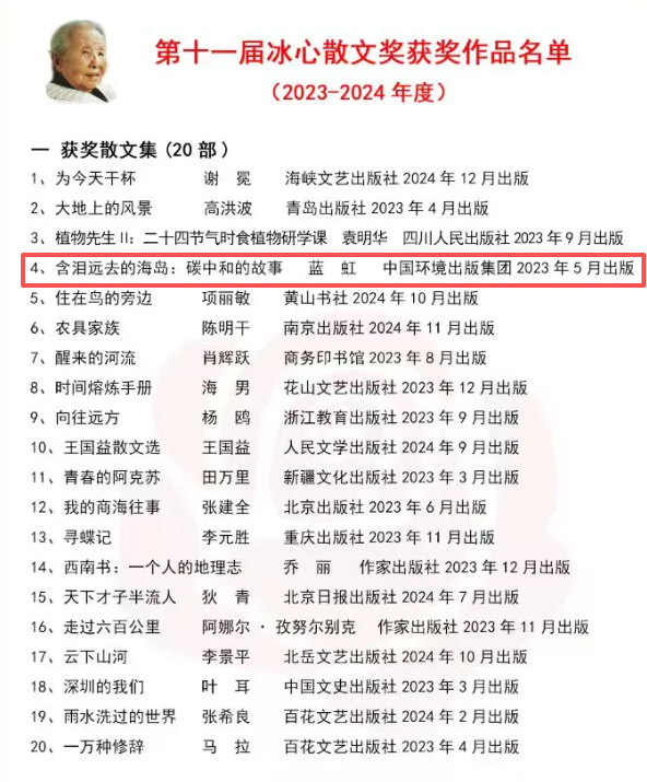 2025年10月30日,第十一屆冰心散文獎在貴州遵義仁懷市揭曉。我集團出版的《含淚遠去的海島:碳中和的故事》成功入選。