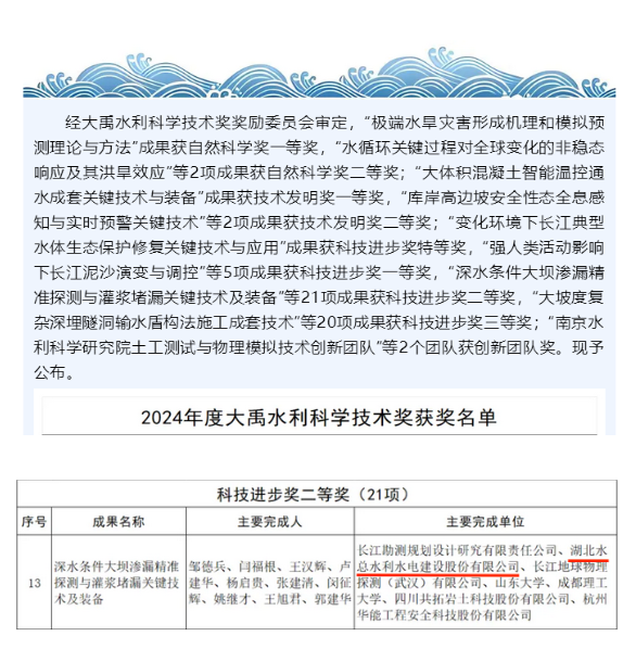 2024年11月27日,經大禹水利科學技術獎獎勵委員會審定、水利部批準,2024年度全國水利行業最高科技獎“大禹水利科學技術獎”授獎名單公布,其中由湖北水總水利水電建設股份有限公司完成的“深水條件大壩滲漏精準探測與灌漿堵漏關鍵技術及裝備”技術成果獲得科技進步二等獎。